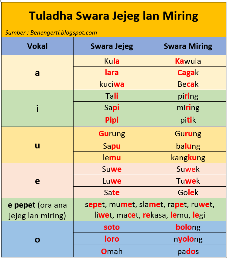 Tulisan kang kacithak werna abang minangka tenger swara jejeg utawa swara miring gumantung tuladha kang dikarepake. {tulisan yang dicetak warna merah merupakan tulisan yang dimaksut sebagai contoh swara jejeg atau swara miring}